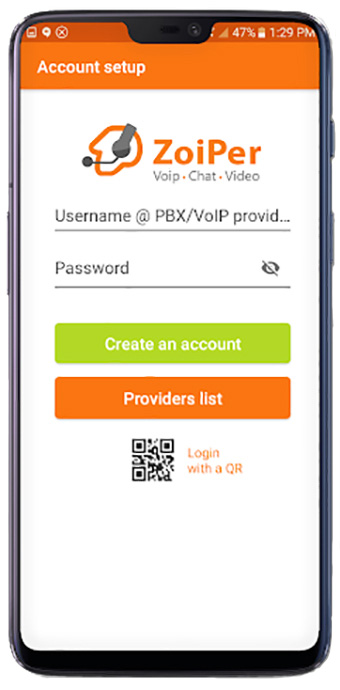 پس از اجرای نرم افزار زویپر در قسمت تنظیمات نرم افزار زویپر > قسمت Account ، یک اکانت جدید ایجاد نموده و قسمت های Username@PBX و را Password مانند تصویر تکمیل می گردد و دکمه Create an account را کلیک نمایید.