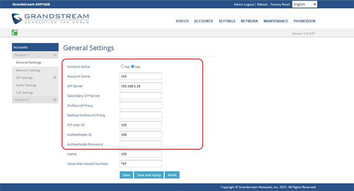 در بخش General Settings گزینه Account Active را روی حالت yes و Account Name ،Sip sever (ip سرور )، Sip User ID (شماره داخلی )، Authenticate ID (شماره داخلی) و Authenticate password (پسورد داخلی) را وارد نمایید. (در تمامی مراحل پس از تنظیمات Save and Apply انجام دهید.)