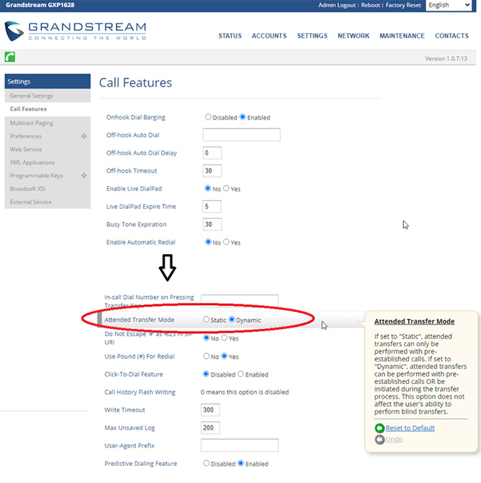 در قسمت Call Features گزینه Attended Transfer Mode را روی حالت Dynamic قرار دهید.