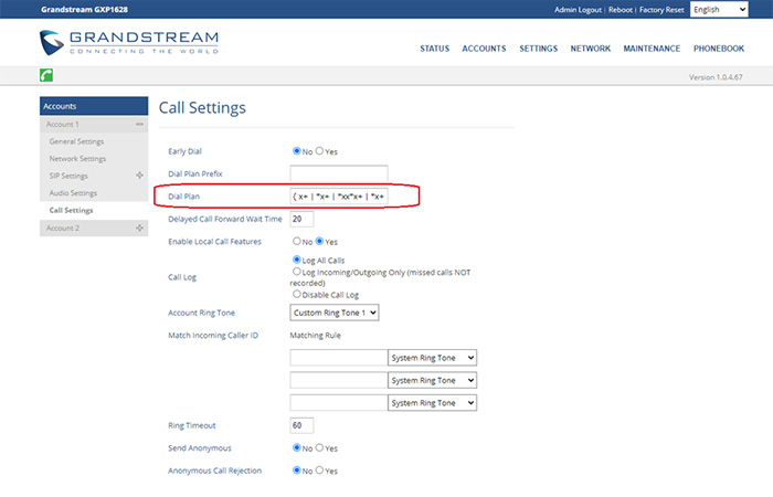 در بخش Call Settings در گزینه Dial Plan عبارت { x+ | *x+ | *xx*x+ | *xxxxx*xxx+| **xxx+ } را قرار دهید.