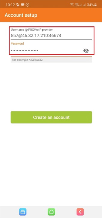 پس از اجرای نرم افزار زویپر در قسمت تنظیمات نرم افزار زویپر > قسمت Account ، یک اکانت جدید ایجاد نموده و قسمت های Username@PBX و را Password مانند تصویر تکمیل می گردد و دکمه Create an account را کلیک نمایید.