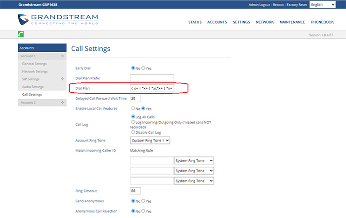 در بخش Call Settings در گزینه Dial Plan عبارت { x+ | *x+ | *xx*x+ | *xxxxx*xxx+| **xxx+ } را قرار دهید.