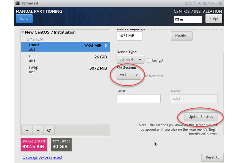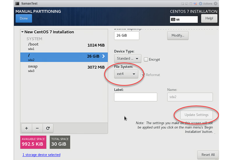 خود سیستم خودکار پارتیشن هایی را می سازد. هر دو قسمت boot و (sda2)  / را جداگانه کلیک کرده و گزینه File System را روی ext4 قرار دهید  و هر مرحله Update Settings را بزنید.