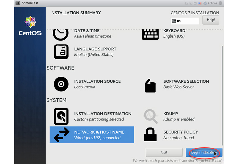 با انجام این مراحل تنظیمات اولیه انجام شده است و می­توانید بر روی begin installation  جهت نصب کلیک نمایید.