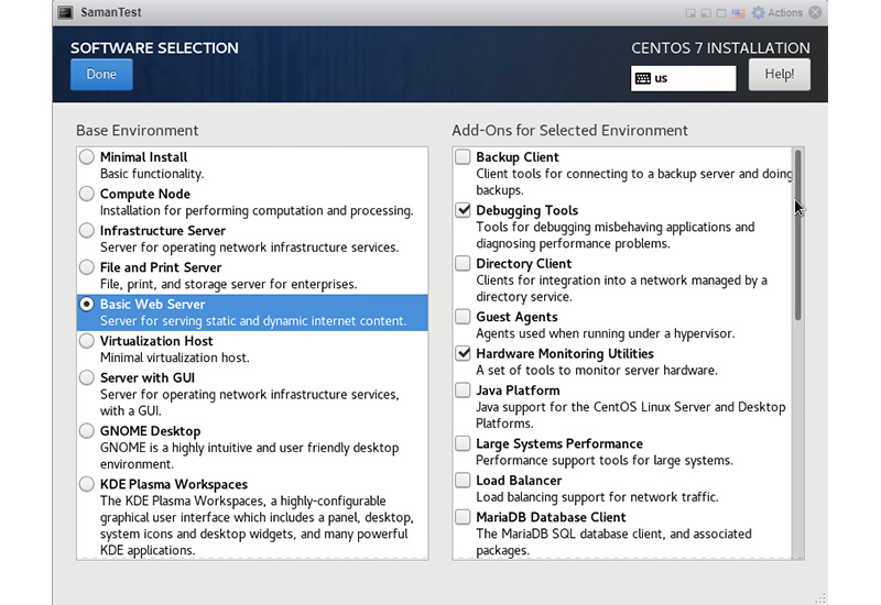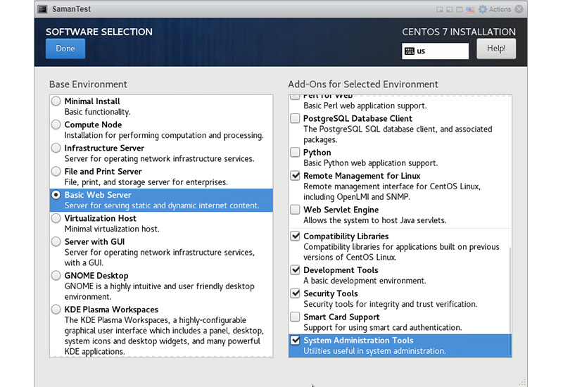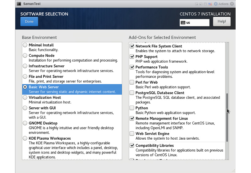 گزینه Basic Web Server را انتخاب کرده و مانند تصویر تیک گزینه های مورد نیاز را فعال نمایید و روی دکمه Done کلیک کنید.