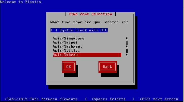 • تنظیمات منظقه زمانی سرور الستیکس را تعیین می کنیم که در ایران Asia/Tehran انتخاب می شود.