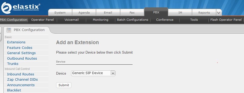 برای تعریف داخلی ها وارد قسمت PBX >>> PBX Configuration >>> Extension شوید. از قسمت Device نوع پروتکل داخلی ها را انتخاب کنید و Submit را بزنید.