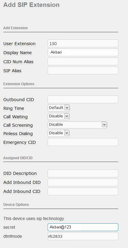 • Display Name انتخاب نام برای داخلی