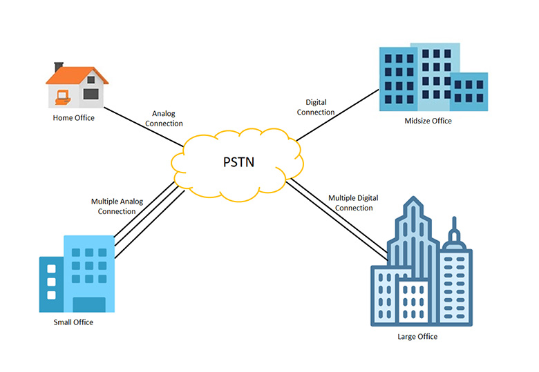 جهت برقراری ارتباط PSTN چندین روش وجود دارد. کاربران خانگی و دفاتر کوچک ،می توانند از پورت های آنالوگ استفاده کنند. هر زوج سیم امکان برقراری یک تماس را فراهم می کند. در صورت نیاز به چندین تماس آنالوگ می توان از یک یا چند خط E1 یا T1 استفاده کرد. این ارتباطات را می توانید در تصویرپایین مشاهده کنید.