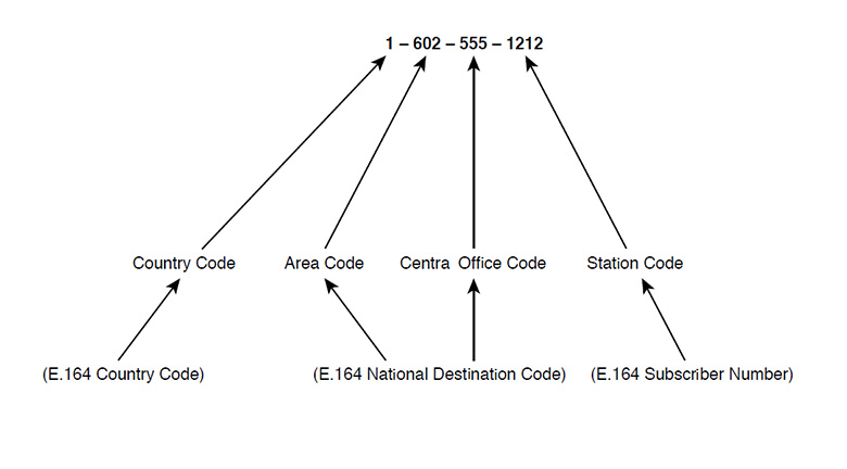 به طور مثال ، طرح شماره گیری شمال آمریکا ، ( NANP ) از استاندارد E.164 جهت تقسیم شماره ها به صورت زیر استفاده می کند :