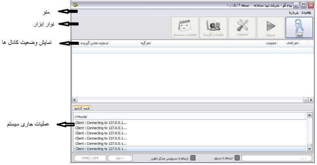 1- مدیریت پیام ­گو :   صفحه اصلی نرم افزار نمایش داده می شود که به کاربر امکان مشاهده وضعیت کانالها و تنظیمات سیستم را می دهد .