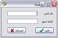 ورود : با انتخاب این گزینه کادری مانند شکل زیر ظاهر می گردد که باید نام کاربر و کلمه عبور را وارد نمایید . پس از وارد کردن نام کاربر و کلمه عبور و زدن دکمه تأیید در صورتی که اطلاعات وارد شده معتبر بوده و کاربری با این مشخصات قبلا در سیستم تعریف شده باشد این پنجره بسته شده و کاربر مجاز به استفاده از نرم افزار می گردد . عملیات Login‌ به دلیل جلوگیری از ورود کاربران غیر مجاز تعبیه شده است .