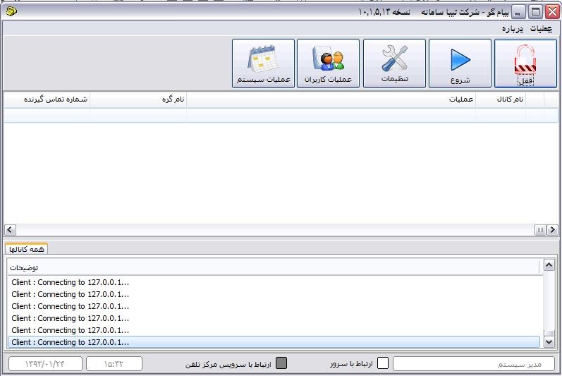 جهت شروع به کار ابتدا روی شمای برنامه راست کلیک کرده وگزینه مدیریت سیستم را انتخاب نمائید . پس از انتخاب گزینه مدیریت سیستم صفحه ای مطابق شکل زیر ظاهر می گردد . که شامل منو، نوار ابزار، نمایشگر وضعیت کانالها و عملیات جاری سیستم می باشد .