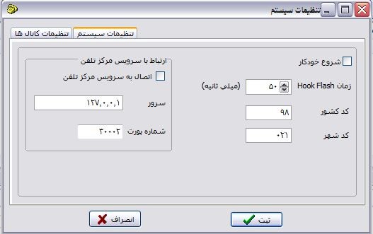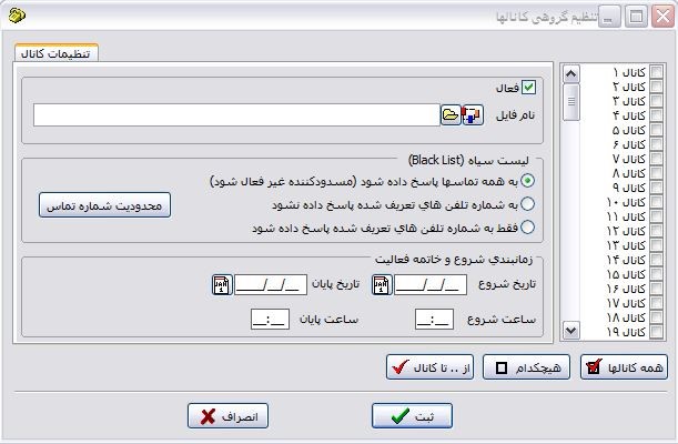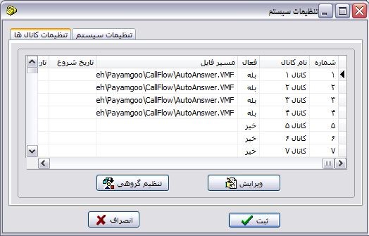 تنظیمات : در این بخش قادر خواهید بود، تنظیمات کلی سیستم شامل شروع خودکار سیستم در هنگام اجرا، ذخیره شدن عملیات در بانک اطلاعاتی و همچنین تنظیمات کانالها شامل فایل حاوی سناریو پاسخگویی و زمانهای فعالیت سیستم را مشخص نمائید. پس از انتخاب این گزینه فرم زیر نمایش داده می شود این فرم شامل دو بخش "تنظیمات کانالها" و "تنظیمات سیستم" می باشد. در بخش تنظیمات کانالها، مواردی که به تک تک خطوط تلفن متصل شده به سیستم مربوط می باشد وجود دارد و در بخش بعدی اطلاعاتی که به کل فعالیت سیستم مربوط می باشند نشان داده می شوند .