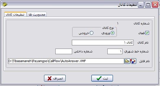 نام فایل : شامل نام فایلی است که سناریو نحوه پاسخگویی به خط تلفن را مشخص می نماید. این فایل دارای پسوند VMF . می باشد که توسط نرم افزار پیام نگار (Calleditor) ساخته می شود و در آن اطلاعات چگونگی عملکرد سیستم، آدرس فایلهای صوتی منوها، شماره گیری داخلی ها و غیره قرار دارد. در صورتی که برای کانالی نام فایل ذکر نشده باشد و یا فایل ارائه شده در مسیر ذکر شده وجود نداشته باشد سیستم قادر به انجام عملیات نخواهد بود و پیغام خطا اعلام خواهد نمود. به کمک دکمه که در کنار این گزینه قرار دارد می توانید فایلهای روی هارد دیسک را Browse‌ کنید و فایل مربوطه را انتخاب نمائید. در صورت زدن کلید مجاور گزینه مربوطه ، فایل مشخص شده در این بخش با نرم افزار پیام نگار (Calleditor) باز می شود و می توانید نحوه عملکرد آنرا مشاهده نمائید و یا تغییرات لازم را انجام دهید.